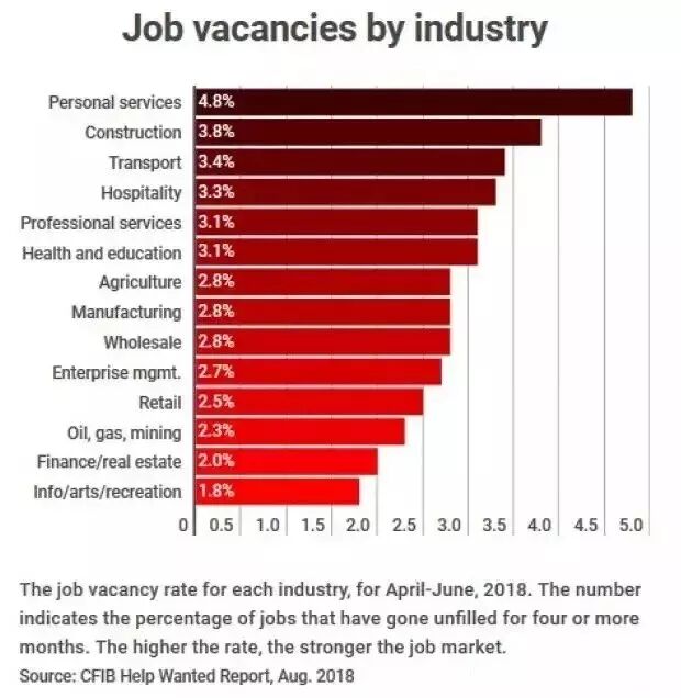 据加拿大统计局数据显示,加拿大在2018年第二季度共有397,400个职位空缺,超过82%的空缺职位集中在魁省,安省及BC省。其中,BC省有超过24,000个空缺职位,职位空缺率达到3.4%,较去年同期上升明显。